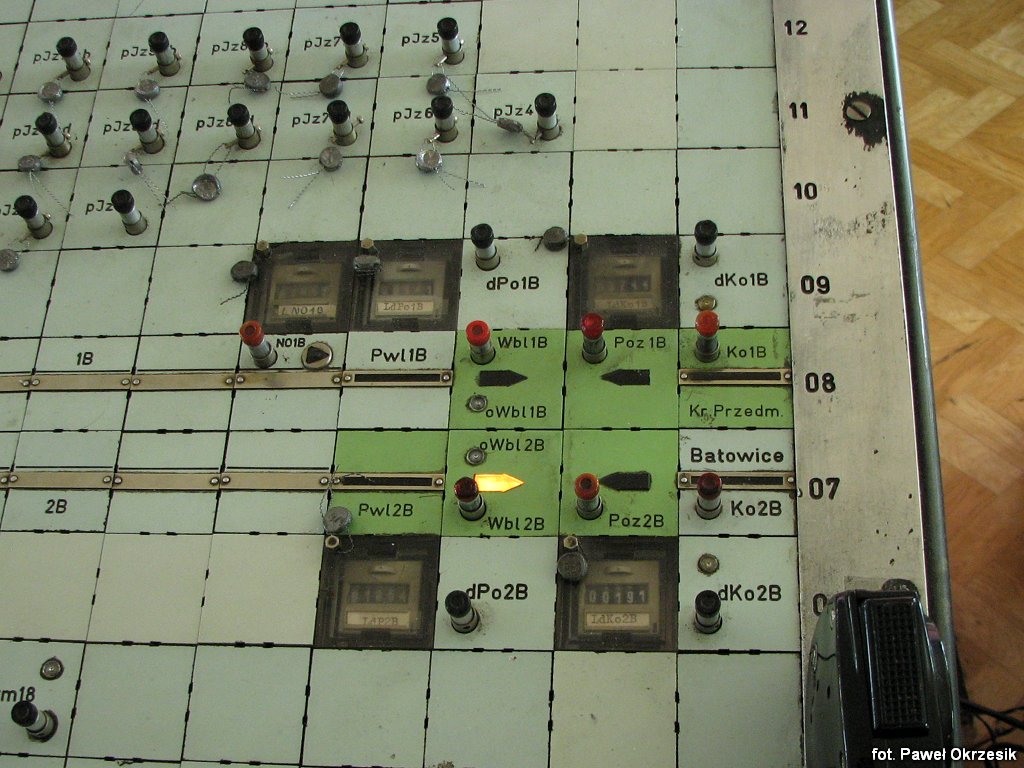 Personel nastawni ma obowiązek obserwować przejeżdżający pociąg celem sprawdzenia stanu technicznego taboru, stanu ładunku, zamknięcia drzwi w wagonach, prawidłowości zatrzymania się składu w wyznaczonym miejscu itp. 3.2. Współpraca posterunków technicznych w obrębie stacjiJeżeli stacja podzielona jest na kilka okręgów nastawczych, konieczna jest współpraca poszczególnych nastawni przy przygotowywaniu dróg przebiegów. Uzależnienie funkcjonowania urządzeń stacyjnych na poszczególnych nastawniach realizowane jest przez blokadę stacyjną i polega na przekazywaniu nakazów (z nastawni dysponujących do wykonawczych) lub zgód (z nastawni wykonawczych do dysponujących lub pomiędzy dwiema nastawniami dysponującymi), których danie uzależnione jest od przygotowania drogi przebiegu w okręgu nastawni dającej nakaz/zgodę, a otrzymanie jest warunkiem podania sygnału zezwalającego na jazdę w drugiej nastawni. Przy prawidłowo działającej blokadzie stacyjnej dyżurny ruchu telefonicznie informuje biorące udział w przygotowywaniu drogi przebiegu posterunki techniczne o numerze pociągu, kierunku jazdy i numerze toru, po czym - jeżeli sygnał podawany jest z nastawni wykonawczej - daje nakaz poprzez blokadę stacyjną, co jest równoznaczne z poleceniem przygotowania drogi przebiegu i podania sygnału. Informacja o numerze pociągu i drodze przebiegu podawna jest w następującej formie: "Pociąg ... z ... na tor ..." lub"Pociąg ... z toru ... do ..." W przypadku braku blokady stacyjnej lub jej nieprawidłowego działania stosowane jest telefoniczne polecanie i zgłaszanie przygotowania drogi przebiegu. Dyżurny ruchu daje telefonicznie polecenie przygotowania drogi przebiegu posterunkom technicznym biorącym udział w przygotowaniu drogi przebiegu, a jej przygotowanie zgłaszane jest dyżurnemu ruchu. Podanie sygnału zezwalającego na jazdę przez nastawniczego - o ile ma miejsce - odbywa się na osobne polecenie. Dyżurnemu ruchu zgłaszany jest również wjazd lub wyjazd pociągu. Polecenia, informacje i zgłoszenia zapisywane są w książce przebiegów, którą prowadzą pracownicy nastawni wykonawczych i innych podległych posterunków ruchu, a przy wprowadzeniu telefonicznego polecania i zgłaszania przygotowania drogi przebiegu - również dyżurny ruchu[3]. Ruch manewrowy do bocznic stacyjnych zakładów, które posiadają własny posterunek ruchu (np. nastawnia zakładowa i dyżurny ruchu bocznicy) z reguły odbywa się na zasadzie żądania i dania zgody na przejazd, niekiedy stosowane jest także powiadamianie o odjeździe i przyjeździe składu. Prowadzony może być osobny dziennik ruchu dla bocznicy z ustalonym oznaczaniem składów manewrowych - np. skrótem literowym nazwy bocznicy i kolejnymi numerami parzystymi/nieparzystymi. Szczegółowe zasady obsługi każdej bocznicy określa regulamin techniczny stacji. Powiązane strony:4. Prowadzenie ruchu kolejowego na szlakach4.1. Najstarsze sposoby prowadzenia ruchu kolejowegoNajprostszym sposobem wykluczenia zagrożenia zderzenia się pociągów na szlaku jest stosowanie jednej lokomotywy do obsługi danej linii lub odcinka. Obsługa zwrotnic i zabezpieczanie odstawionych wagonów na punktach ładunkowych jest wówczas obowiązkiem drużyny trakcyjnej, a obsada posterunków ruchu jest zbędna. Sposób ten sporadycznie jest jeszcze stosowany na niektórych lokalnych, zwykle zakończonych ślepo liniach, na których nie ma zapotrzebowania na większy ruch pociągów[6]. Najstarszym sposobem wykluczenia wyjazdu dwóch pociągów z przeciwnych kierunków na szlak jednotorowy, wywodzącym się z czasów, gdy nie było jeszcze łączności telegraficznej ani telefonicznej, jest prowadzenie ruchu z wykorzystaniem pilota lub berła. Pilot był pracownikiem kolejowym wyznaczonym dla danego szlaku, bez którego żaden pociąg nie mógł wyjechać na szlak, zatem niebezpieczeństwo wyjazdu dwóch pociągów z przeciwnych kierunków było wykluczone. Analogiczną funkcję spełniało berło, będące znakiem z metalu (np. w formie pręta lub obręczy) z wypisanymi nazwami końcowych stacji szlaku, które otrzymywał maszynista wyprawianego pociągu. W razie potrzeby wyprawienia kilku pociągów w tym samym kierunku pilot osobiście wydawał pisemne polecenia maszynistom wszystkich pociągów z wyjątkiem ostatniego, który sam odprowadzał, natomiast w przypadku użycia berła polecenia te wydawał zawiadowca (dyżurny ruchu), okazując przy tym berło, które otrzymywał maszynista ostatniego wyprawianego pociągu[7]. Niedogodnością prowadzenia ruchu z wykorzystaniem pilota lub berła był brak możliwości wyprawienia pociągu, gdy pociąg z przeciwnego kierunku został odwołany. Rozwiązaniem tego problemu były aparaty berłowe, czyli połączone ze sobą elektrycznie urządzenia umieszczone na obu końcach szlaku, trzymające pod zamknięciem większą liczbę bereł. W danym momencie wyjęte mogło być tylko jedno berło. Zasada działania aparatów berłowych polegała na odwróceniu polaryzacji obwodu przy wyjęciu/włożeniu berła, powodującym uniemożliwienie zwolnienia kolejnego berła do czasu, gdy wyjęte berło nie zostało zwrócone do jednego z aparatów. Od działania aparatów berłowych uzależnione mogły być semafory wyjazdowe. Odmiennymi sposobami prowadzenia ruchu na odcinkach jednotorowych w przypadku braku łączności pomiędzy stacjami był ruch z zachowaniem punktów krzyżowania oraz ruch z zachowaniem pierwszeństwa kierunku[7]. Ruch z zachowaniem punktów krzyżowania polegał na tym, że każdy pociąg mógł bez porozumienia dojechać do stacji, na której w rozkładzie jazdy wyznaczono krzyżowanie z innym pociągiem. Na stacji tej musiał oczekiwać na przybycie tego pociągu lub otrzymać pisemne pozwolenie z następnej stacji na dalszą jazdę. Ruch z zachowaniem pierwszeństwa kierunku polegał na tym, że pociągi mogły być wyprawiane bez porozumienia w jedn