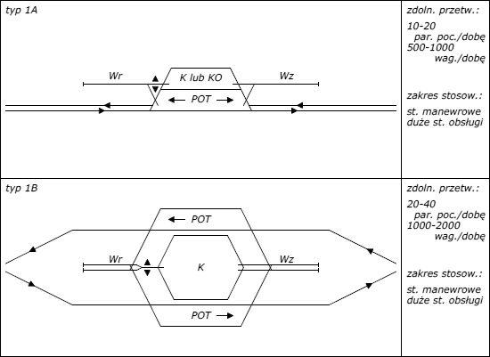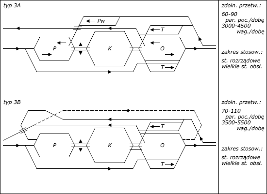 Zestawianie składów wagonów zgromadzonych na torze kierunkowym, obejmujące porządkowanie wagonów według kryteriów techniczno-ruchowych oraz dalszej relacji, odbywa się na końcówkach torów kierunkowych lub na grupie porządkowej, w tzw. rejonie zestawiania. Rejon zestawiania powinien umożliwiać jednoczesne zestawianie kilku składów na różnych wiązkach torów. Nastawnia prowadząca ruch w rejonie zestawiania nazywana jest nastawnią zestawczą, a proces zestawiania kierowany jest przez dyżurnego ruchu manewrowego[3]. Na infrastrukturę stacji rozrządowej składają się ponadto lokomotywownie, wagonownie, rejony torów ładunkowych itp. Charakterystyczne typy układu zasadniczych grup torów stacji rozrządowych, manewrowych i obsługi przemysłu wraz z ich orientacyjnymi zdolnościami przetwórczymi przedstawiono na rys. 2-5[1]. ![]() Rys. 2. Układy zasadniczych grup torów typu 1A, 1B oznaczenia: Wr - tor wyciągowy dla rozrządzania, Wz - tor wyciągowy dla zestawiania Typy 1A oraz 1B charakteryzują się poprzecznym układem grup torów, przy czym składy rozrządzane są przez górkę rozrządową z toru wyciągowego. Po rozrządzeniu składy z reguły muszą zostać przestawione na tory odjazdowe, co wiąże się z naruszaniem dróg przebiegów pociągowych. Liczba sprzecznych jazd może zostać ograniczona poprzez zastosowanie oddzielnych grup POT dla każdego kierunku ruchu, z umieszczoną między nimi grupą kierunkową (typ 1B). ![]() Rys. 3. Układy zasadniczych grup torów typu 2A, 2B oznaczenia: Wz - tor wyciągowy dla zestawiania Typy 2A oraz 2B posiadają częściowo podłużny układ grup torów. Podłużnie względem siebie umieszczone są grupa przyjazdowa i grupa kierunkowo-odjazdowa lub kierunkowa, a między nimi ulokowana jest górka rozrządowa. Prowadzone rozrządzanie może być kolizyjne z wjazdem pociągów na grupę przyjazdową od strony górki rozrządowej - w takiej sytuacji pociąg przyjmowany jest na grupę przyjazdową wstępną, gdzie oczekuje na przerwanie rozrządzania. Ponadto stosowane są grupy tranzytowe oraz opcjonalnie odjazdowe, o ile funkcji tej nie pełni grupa kierunkowa - wówczas rozrządzone i zestawione składy muszą zostać przestawione między tymi grupami. ![]() Rys. 4. Układy zasadniczych grup torów typu 3A, 3B Typy 3A oraz 3B posiadają trzy grupy torów w układzie podłużnym: przyjazdową, kierunkową oraz odjazdową. W typie 3B grupę przyjazdową wstępną zastąpiono pętlą umożliwiającą wjazd pociągów na grupę przyjazdową zawsze od jednej strony, co eliminuje sprzeczność wjazdu z manewrami prowadzonymi przy górce rozrządowej. Podobne zadanie spełniać może pętla przy grupie odjazdowej. Rozwiązania takie są jednak spotykane bardzo rzadko z uwagi na zajęcie dużej powierzchni terenu. ![]() Rys. 5. Układ zasadniczych grup torów typu 4 Typ 4 jest typem o największej zdolności przetwórczej i zajmuje największą powierzchnię. Jest on połączeniem dwóch układów typu 3A (P-K-O) przeznaczonych dla przeciwnych kierunków ruchu. Część wagonów gromadzonych na grupach kierunkowych przeznaczona jest do wyjazdu w kierunku innym od kierunku danego układu, dlatego po rozrządzeniu wyciągane są one na grupę przyjazdową przeciwnego kierunku i rozrządzane są ponownie. Najczęściej spotykanym układem grup torów stacji rozrządowej na PKP jest typ 3A lub jego odmiany - przykładami stacji o takim układzie są Łódź Olechów, Poznań Franowo, Warszawa Praga, Wrocław Brochów i Zabrzeg Czarnolesie. Układy dwukierunkowe zastosowano np. na stacjach Tarnowskie Góry, Kraków Prokocim Towarowy, Kraków Nowa Huta i Dąbrowa Górnicza Towarowa. Na stacji Kraków Nowa Huta, obsługującej Hutę im. T. Sendzimira, zastosowano pętle umożliwiające wjazdy na grupę przyjazdową i odjazdy z grupy odjazdowej z jednej strony w dowolnym kierunku. 4. Proces technologiczny pracy stacjiProces technologiczny pracy stacji obejmuje[3]: