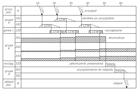 Obróbka wagonów tranzytowych dotyczy wagonów pochodzących z pociągów przeznaczonych do rozrządzania na danej stacji i rozpoczyna się od przyjazdu i przygotowania składu pociągu do rozrządzania. Po przyjeździe odłączana jest lokomotywa pociągowa, sprawdzany jest stan techniczny wagonów i ładunku, sporządzana jest karta rozrządowa i rozłączane są sprzęgi hamulcowe w miejscach rozłączania odprzęgów. Następnie skład jest napychany na górkę rozrządową (lub przestawiany na tor wyciągowy) i rozrządzany. Jeżeli górka rozrządowa wyposażona jest w dwa tory, przy rozrządzaniu pracować mogą dwie lokomotywy - w takim przypadku w czasie gdy pierwsza z nich rozrządza jeden skład, druga może wrócić na grupę przyjazdową i podepchnąć do górki kolejny. Rozrządzanie jest czasowo przerywane na dopychanie wagonów na torach kierunkowych (usuwanie luk pomiędzy odprzęgami) oraz przetaczanie wagonów które nie mogą być rozrządzane przez górkę z uwagi na swoją konstrukcję lub przewożony ładunek. Rozrządzanie może zostać połączone z zestawianiem przez takie wyznaczenie przeznaczenia relacyjnego torów kierunkowych, aby można było stosunkowo łatwo zestawić skład poprzez zebranie i połączenie wagonów zgromadzonych na tych torach. Wagony akumulowane są na torach grupy kierunkowej do czasu, aż ich liczba będzie wystarczająca na nowy skład wagonowy. Korzystne jest zakończenie akumulacji po rozrządzeniu na dany tor dużej grupy wagonów. Po zakończeniu zestawiania składu wagonów jest on wystawiany na grupę odjazdową i przeprowadzana jest obróbka składu pociągu przygotowująca go do odjazdu. Sprzęgnięcie sprzęgów i przewodów hamulcowych zależnie od warunków miejscowych może być wykonywane na torach kierunkowych lub odjazdowych. Przygotowanie do odjazdu obejmuje operacje handlowe oraz oględziny techniczne połączone z próbą hamulców. Równolegle do obróbki składów wagonowych prowadzona jest obróbka dokumentacji przewozowej, obejmująca gromadzenie i przekazywanie dokumentów przewozowych. Obróbka wagonów miejscowych (loco), tzn. podlegających operacjom ładunkowym na danej stacji lub bocznicy stacyjnej, przebiega podobnie do obróbki wagonów tranzytowych. Po zgromadzeniu odpowiedniej liczby wagonów miejscowych na określonym torze kierunkowym są one zabierane i podstawiane pod wyładunek lub naładunek, a po zakończeniu operacji ładunkowych przestawiane na tor kierunkowy zgodnie z ich dalszym kierunkiem jazdy. Obróbka pociągów tranzytowych może odbywać się na wydzielonych torach tranzytowych grupy odjazdowej lub na grupie tranzytowej i może obejmować oględziny techniczne i handlowe, wymianę drużyny pociągowej, wymianę lokomotywy, odłączenie lub przyłączenie grupy wagonów itp. ![]() Rys. 6. Fragment przykładowego graficznego planu dobowej pracy stacji Sposobem prezentacji procesu technologicznego pracy stacji rozrządowej jest graficzny plan dobowej pracy stacji (rys. 6). Na planie tym przedstawione są czynności obsługi poszczególnych pociągów na torach oraz wykres akumulacji wagonów na torach kierunkowych. Czasy trwania czynności określane są metodami analitycznymi lub poprzez obserwacje chronometrażowe. 5. Techniki rozrządzaniaNajprostszym sposobem rozrządzania jest przestawianie lokomotywą odprzęgów na odpowiednie tory kierunkowe. Proces ten przyspieszyć można poprzez odrzucanie wagonów, polegające na rozłączeniu odprzęgu, rozpędzeniu składu przez lokomotywę do określonej prędkości i zahamowaniu, co powoduje swobodne przetoczenie się odprzęgu na tor kierunkowy. Wagony zatrzymują się same wskutek oporów ruchu lub hamowane są płozem hamulcowym[3]. Bardziej efektywnym sposobem jest rozrządzanie grawitacyjne, w którym do rozpędzenia odprzęgu wykorzystuje się odpowiednio wyprofilowany tor, zwany górką rozrządową. Wysokość górki rozrządowej wynosi ok. 2,5-4 m i wyznaczana jest tak, aby zapewnić dojazd wagonu o dużych oporach ruchu (ciężkobieżnego) do punktu obliczeniowego, przyjmowanego w odległości 50-100 m za ukresem ostatniego rozjazdu na torze o największych oporach ruchu (zwykle skrajny tor grupy kierunkowej) przy niekorzystnych warunkach atmosferycznych. Typowo za grzbietem górki znajduje się pochylnia o spadku ok. 40-66 ‰, przechodząca do 12,5-17 ‰ w strefie hamulców odstępowych i wypłaszczająca się w strefie podziałowej. Największą wydajność mają górki wyposażone w dwa tory, które projektowane są na jednakowej wysokości, obliczanej dla warunków zimowych[3]. Dawniej tory dwutorowej górki budowano na różnych wysokościach, obliczanych dla warunków letnich i zimowych (tzw. górka letnia i górka zimowa).