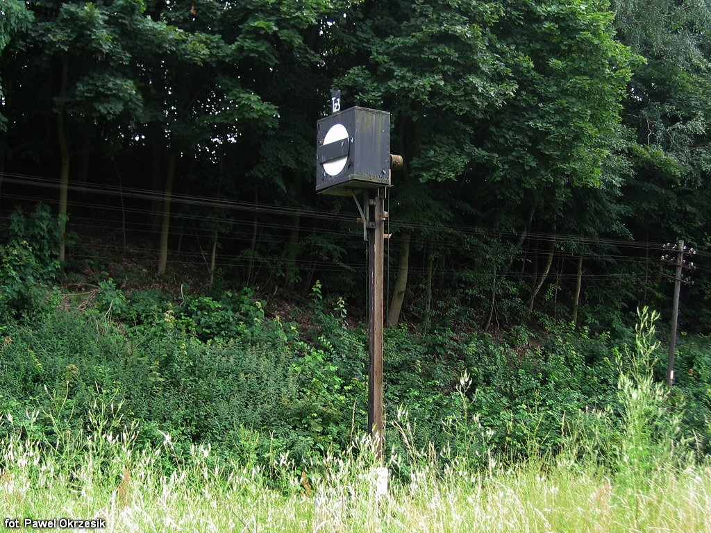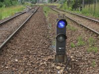 1.3. Tarcze ostrzegawcze i sygnalizatory powtarzająceTarcze ostrzegawcze stosowane są w celu uprzedzenia maszynisty o sygnale, jaki podawany jest na semaforze do którego odnosi się dana tarcza. Tarcze ostrzegawcze ustawia się zasadniczo w odległości drogi hamowania przed semaforem. Funkcję tarczy ostrzegawczej może także pełnić semafor świetlny ustawiony przed danym semaforem - typowo semafor wjazdowy przed semaforem wyjazdowym. W przypadku sygnalizacji kształtowej, gdy możliwe są przebiegi bez zatrzymania przez stację, przy semaforach wjazdowych ustawia się tarcze ostrzegawcze przelotowe (świetlne lub kształtowe) odnoszące się do semaforów wyjazowych. Sygnał na tarczy ostrzegawczej przelotowej podawany jest wraz z sygnałem zezwalającym na semaforze wjazdowym, przy czym przy sygnale "Stój" na semaforze wjazdowym świetlna tarcza ostrzegawcza przelotowa musi być wygaszona. Na liniach drugorzędnych i znaczenia miejscowego wyjątkowo stosowane mogą być tarcze ostrzegawcze nieruchome, informujące jedynie o zbliżaniu się do semafora. Sygnalizatory powtarzające stosowane są w przypadku, gdy wskazania semafora nie są widoczne w sposób ciągły z wymaganej odległości. W razie potrzeby przed jednym semaforem ustawić można do trzech sygnalizatorów powtarzających. Sygnalizator powtarzający podaje sygnały analogiczne jak tarcza ostrzegawcza świetlna, uzupełnione stale świecącym białym światłem, które zapobiega pomyleniu sygnalizatora z semaforem. Sygnalizatory powtarzające stosowane mogą być zarówno przed semaforami świetlnymi, jak i kształtowymi. Sygnalizatorów powtarzających nie można stosować na szlakach z samoczynną blokadą liniową - w razie takiej konieczności zastosować należy wskaźniki W11a zgodnie z instrukcją sygnalizacji Ie-1 (cztery wskaźniki, pierwszy z czterema pasami)[1]. Tarcze ostrzegawcze i sygnalizatory powtarzające oznacza się literami "To" lub "Sp" z dodaniem nazwy semafora, do którego się odnoszą. Oznaczenie sygnalizatora powtarzającego uzupełniane jest rzymskimi cyframi "I" do "III" dodawanymi na początku oznaczenia, określającymi kolejność ustawienia sygnalizatorów powtarzających przed semaforem, licząc w kierunku od semafora (np. "ISpA", "IISpA"). Maszty tarcz ostrzegawczych i sygnalizatorów powtarzających malowane są na szaro[3]. 1.4. Sygnalizatory sygnału zastępczegoSygnalizatory sygnału zastępczego mają postać jednej komory światła białego na szarym maszcie lub w formie sygnalizatora karzełkowego i mogą podawać jedynie sygnał zastępczy. Sygnalizatory sygnału zastępczego można stosować w uzasadnionych przypadkach zamiast semafora wjazdowego z toru lewego szlaku dwutorowego w celu sygnalizowania wjazdów z tego toru, częściej jednak w przypadku braku zorganizowanych przebiegów wjazdowych z toru lewego stosowany jest semafor wjazdowy z komorą światła czerwonego i białego. Sygnalizatory sygnału zastępczego oznacza się literami "Sz", numerem toru przy którym stoi sygnalizator oraz literą "n", np. "Sz2n"[3].
